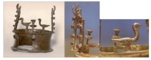 Sólo queda uno de los tres elementos situados cerca de la abertura rectangular. Su forma sugiere que se refiere a la producción de artículos de cobre no utilitarios (de prestigio). Esta tríada está posicionada frente a un par de pájaros, de modo que al observar un grupo de elementos se integra sistemáticamente la información que lleva el otro, posicionado frente a él. Esto promueve una asociación entre los dos grupos. A diferencia de los dos íbices colocados en la corona anterior, los dos pájaros están totalmente representados en el anillo superior. Su presencia, junto con su representación en reposo, evoca la imagen de la nidificación, a su vez reforzada por la forma de nido del cilindro. Esta asociación es especialmente interesante a la luz de la cercanía fonética entre el término para anidar en las primeras lenguas semíticas