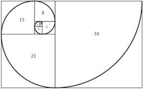 Los lados de los cuadrados son los de la serie de Fibonacci 1, 1, 2, 3, 5, 8, 13 ..