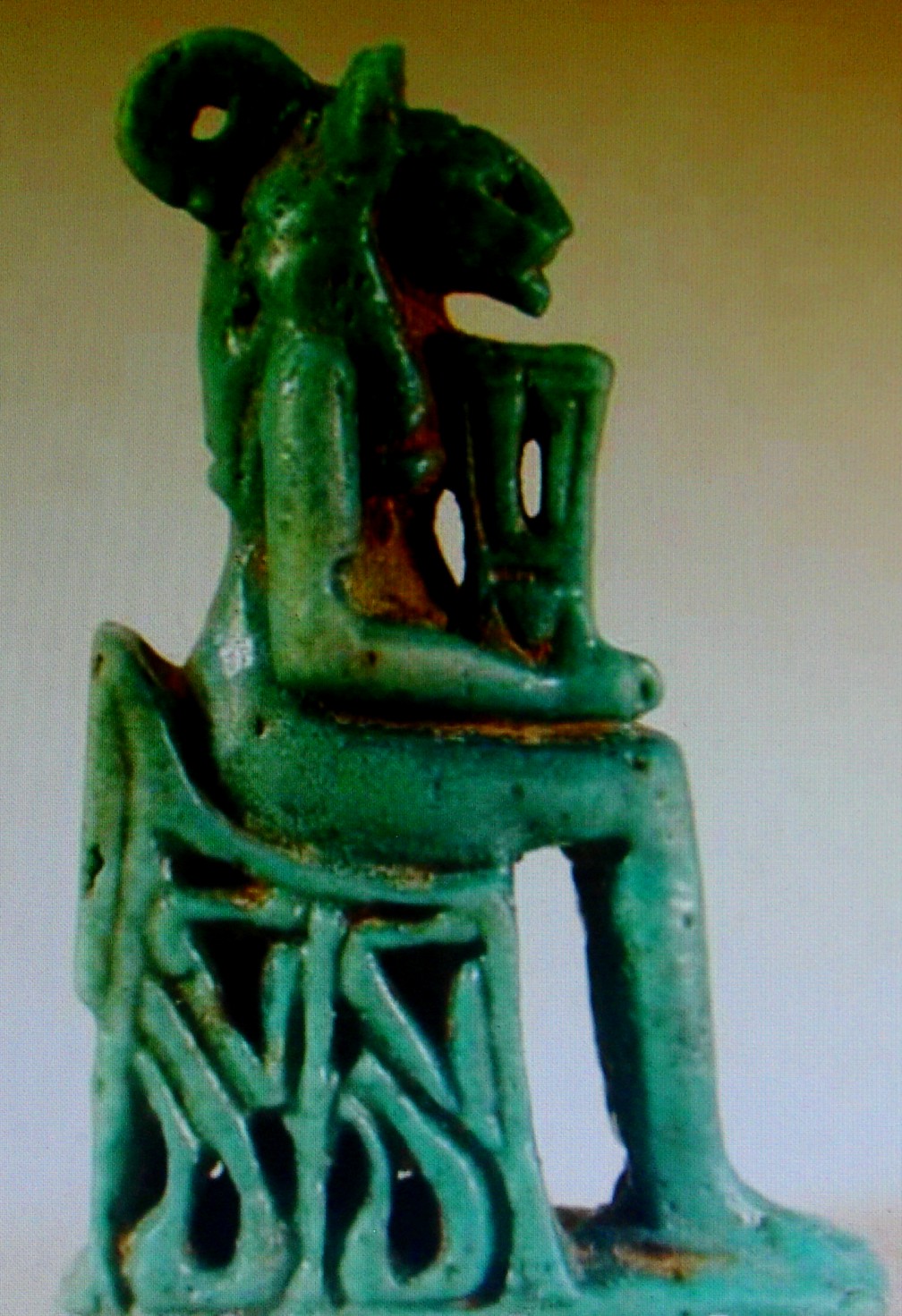Nehebkau’s image appears on another amulet type, this time next to the goddess Sekhmet, whose role in Egyptian medicine mentioned above. Sekhmet is holding a Sistrum in her hands, and sitting on a throne which on both sides there are two Nehebkaus in a snake-like form, relying on their tails.(C. Andrews, Amulets of Ancient Egypt, pp. 33-34.)
