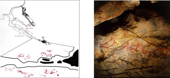 Las paredes de los casi 275 metros, y en los cuales se encuentran repartidas la mayor parte de las representaciones, ejemplifican las técnicas, los temas y los recursos gráficos que los artistas del Paleolítico superior (36.000-10.000 a.C.) utilizaron para expresar una parte de su mentalidad.